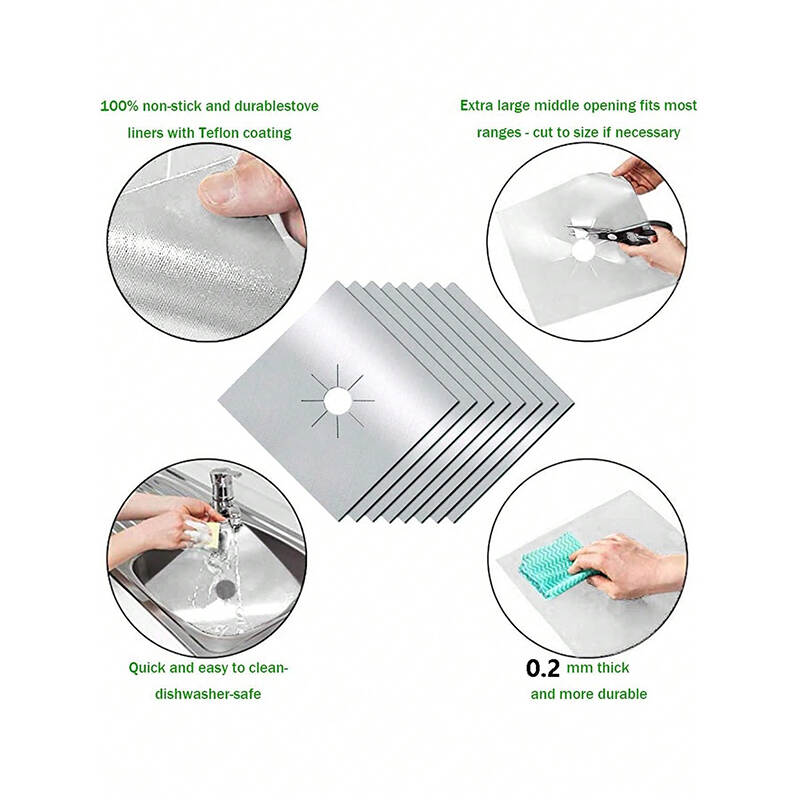 This set of 6 reusable gas stove burner covers is designed for efficient kitchen protection. Crafted from a thick 0.1 mm double-layer non-stick material, these liners resist high heat, grease, and stains, helping maintain a clean stovetop. Washable and reusable, they provide a sustainable and eco-friendly solution that extends the life of kitchen appliances while reducing cleaning time.